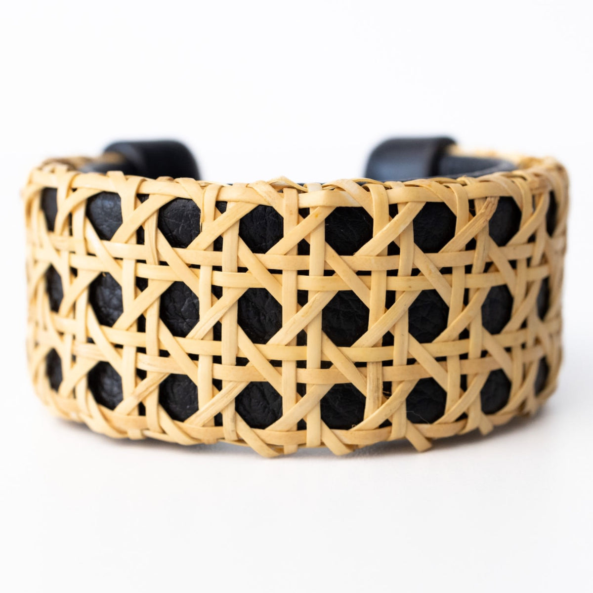 This Centre Street Cuff – Black by Whale Tail Weaving is a fresh take on traditional cane weaving, reimagined into wearable art. Crafted with a woven cane body, Italian leather base, and carved wooden ends, it balances heritage with contemporary style. Evoking the charm of vintage Nantucket basketry, this cuff brings artisanal craftsmanship into modern fashion, offering a bold yet natural statement.