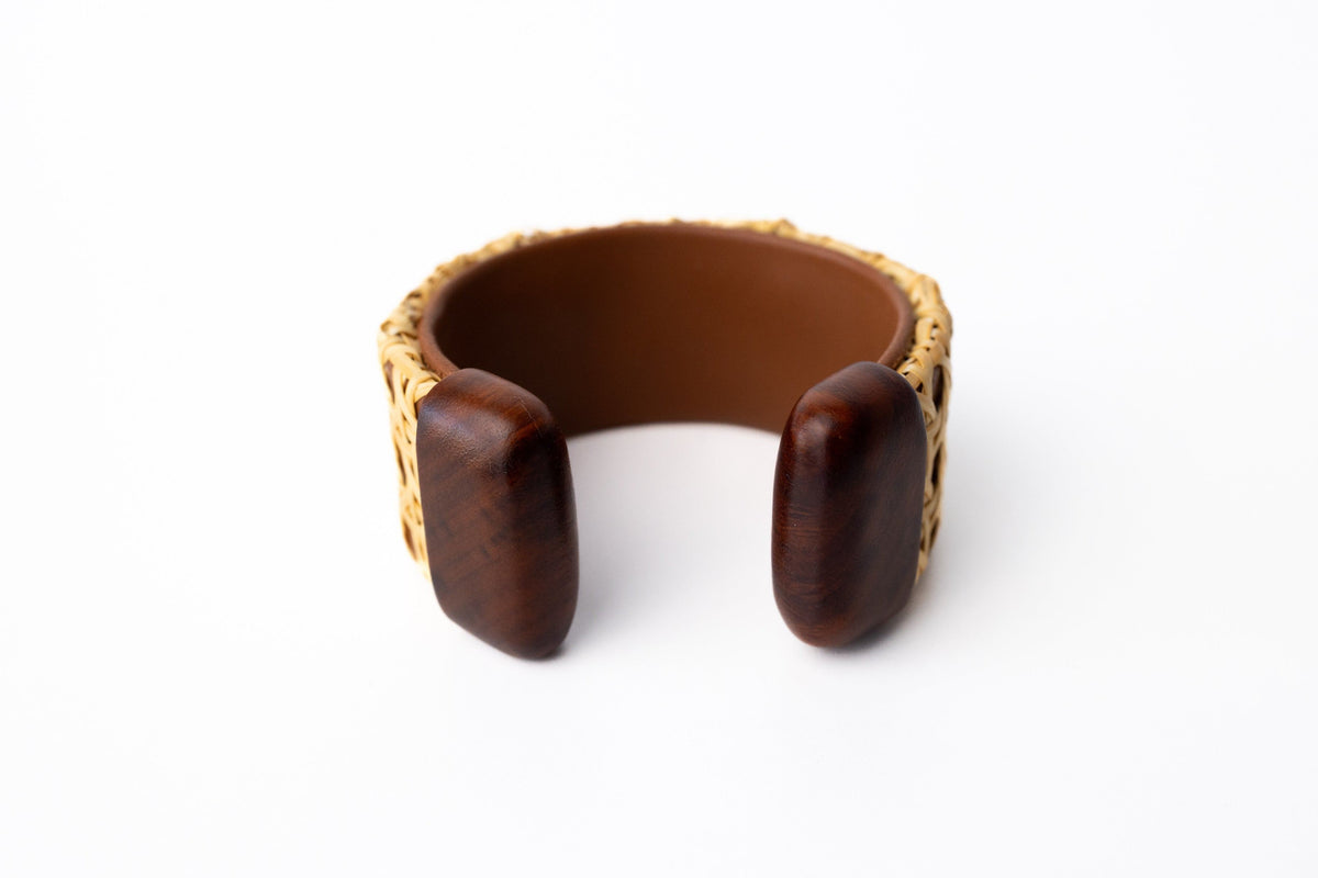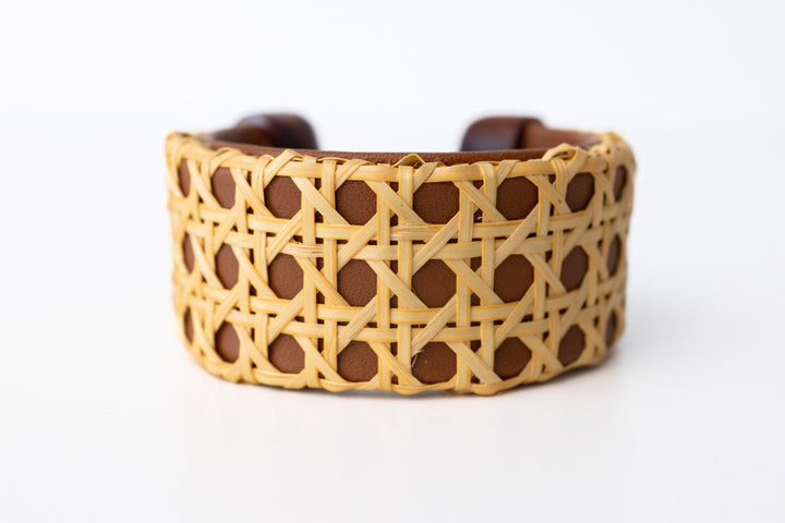 This cuff is made of cane and has an Italian leather base with hand-carved wooden ends. It is available in black, saddle, and white.