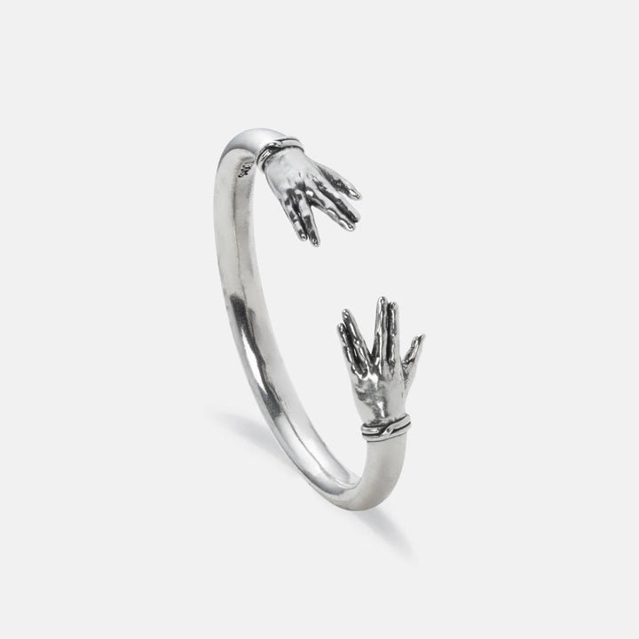 This bangle is crafted from silver and features two hands forming a rallying sign.