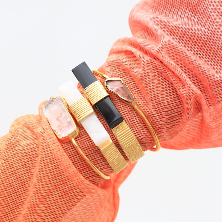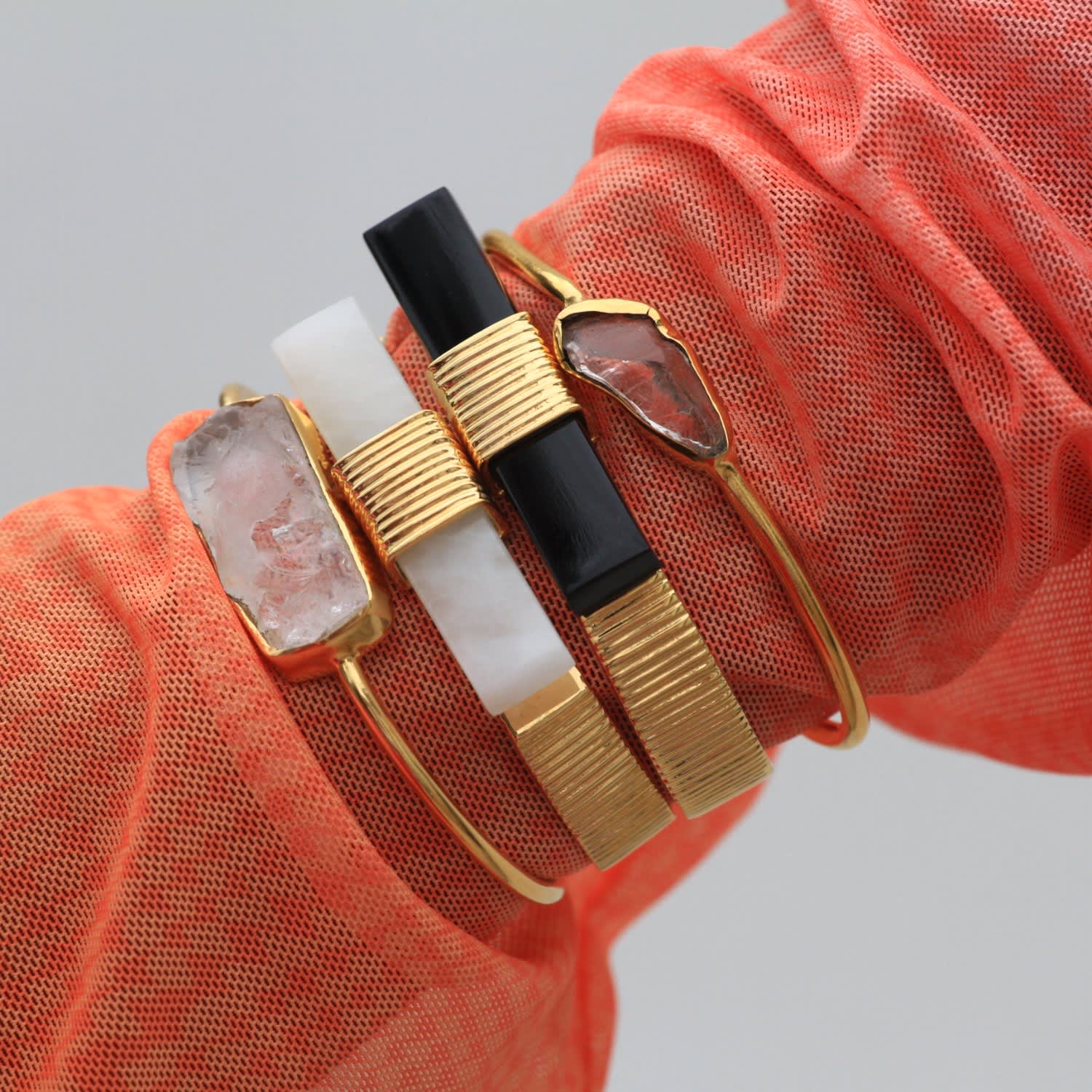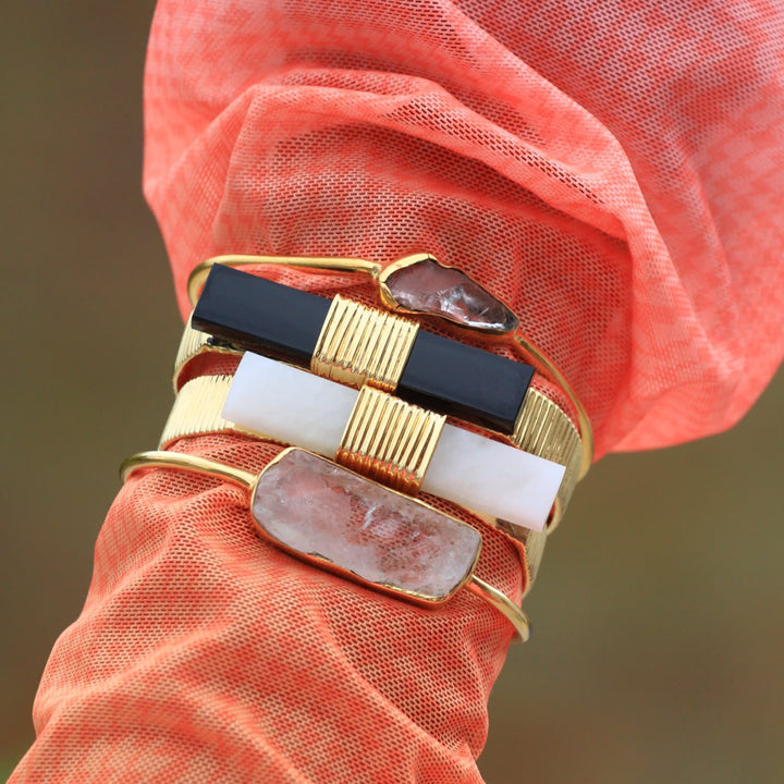 This open cuff bangle is made from 18ct gold-plated brass and features a natural raw-cut crystal.