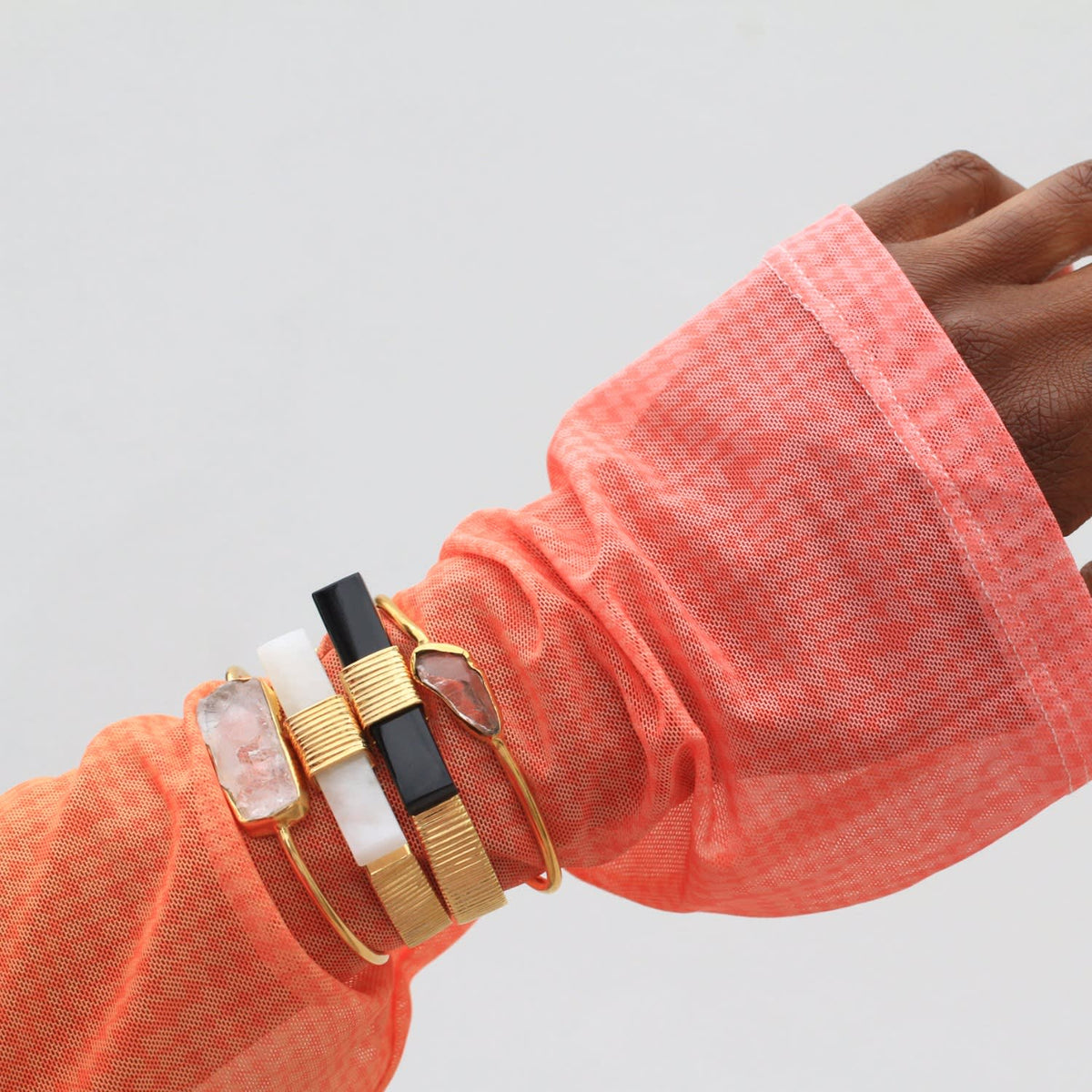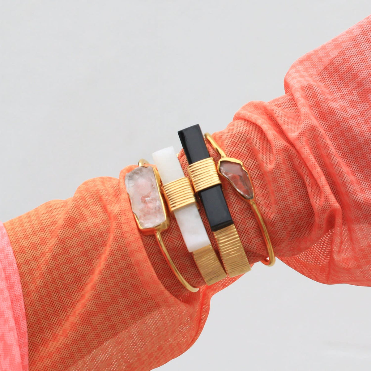 The Quiet Luxury Irregular Crystal Gold Bangle by Yaa Yaa London is a perfect expression of refined simplicity. This open cuff bangle, with its high-polish gold finish and raw-cut clear crystal, is designed for the modern minimalist. Its sculptural and distinctive design makes it a versatile statement piece, perfect for wearing alone or as part of a stack.