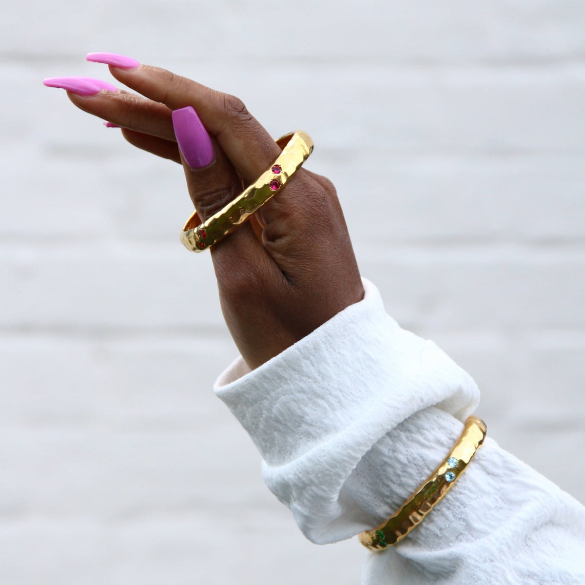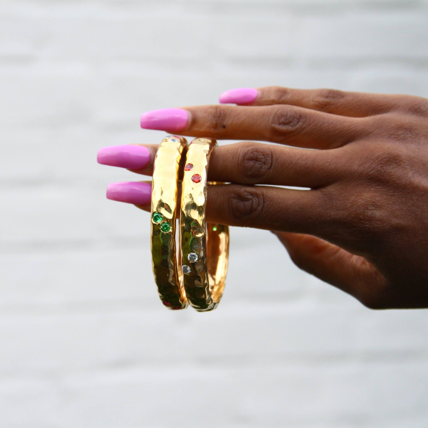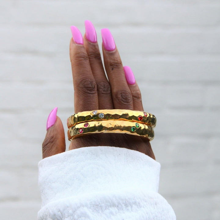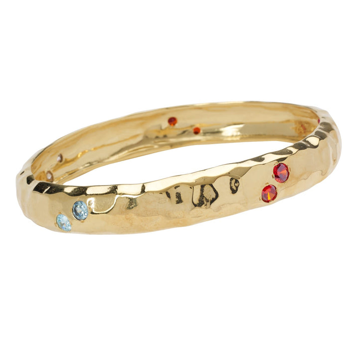 The Luxury Rainbow Jewel Gold Textured Bangle by Yaa Yaa London is a comfortable and eye-catching accessory. This handmade bangle displays a rainbow of zircon colors, including cerise pink, lime green, and pale blue. The hammered 1-micron 18k gold-plated brass gives it a rich look and feel, making it a favorite for color lovers.