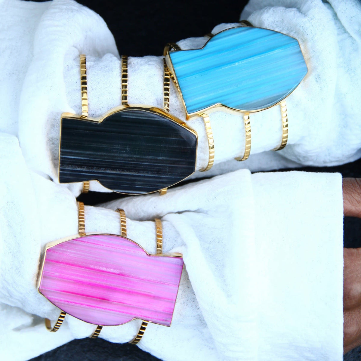This Blue Gemstone Gold Body Cuff Bracelet by Yaa Yaa London is a supremely stunning, handcrafted statement piece. This limited-edition cuff features a curvy agate stone in beautiful shades of blue, set on a textured gold cuff. Each stone is unique, adding a personal and artistic touch to this elegant design. It's a bold and feminine accessory that will make a lasting impression.