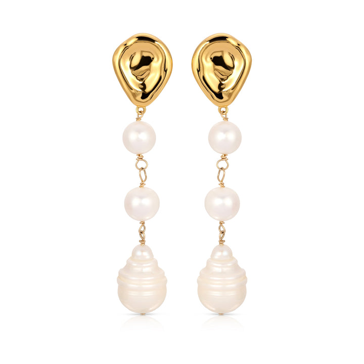 These pearl chandelier earrings are crafted from gold-plated sterling silver and feature freshwater pearls and shell pearls. They have a post-back and a 2.5-inch drop.