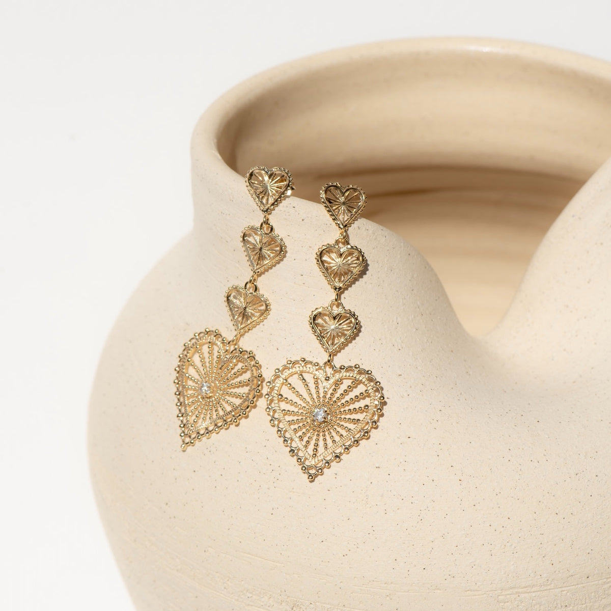 The Mi Amor Earrings by Zoe and Morgan are a carefree and light accessory that sparkles with movement. A trio of sweetness flows to a beautiful exaggerated heart shape, drawing the eye to a central white zircon. These earrings symbolize a commitment to self-love, encouraging you to rebuild your energy and operate from a place of love.