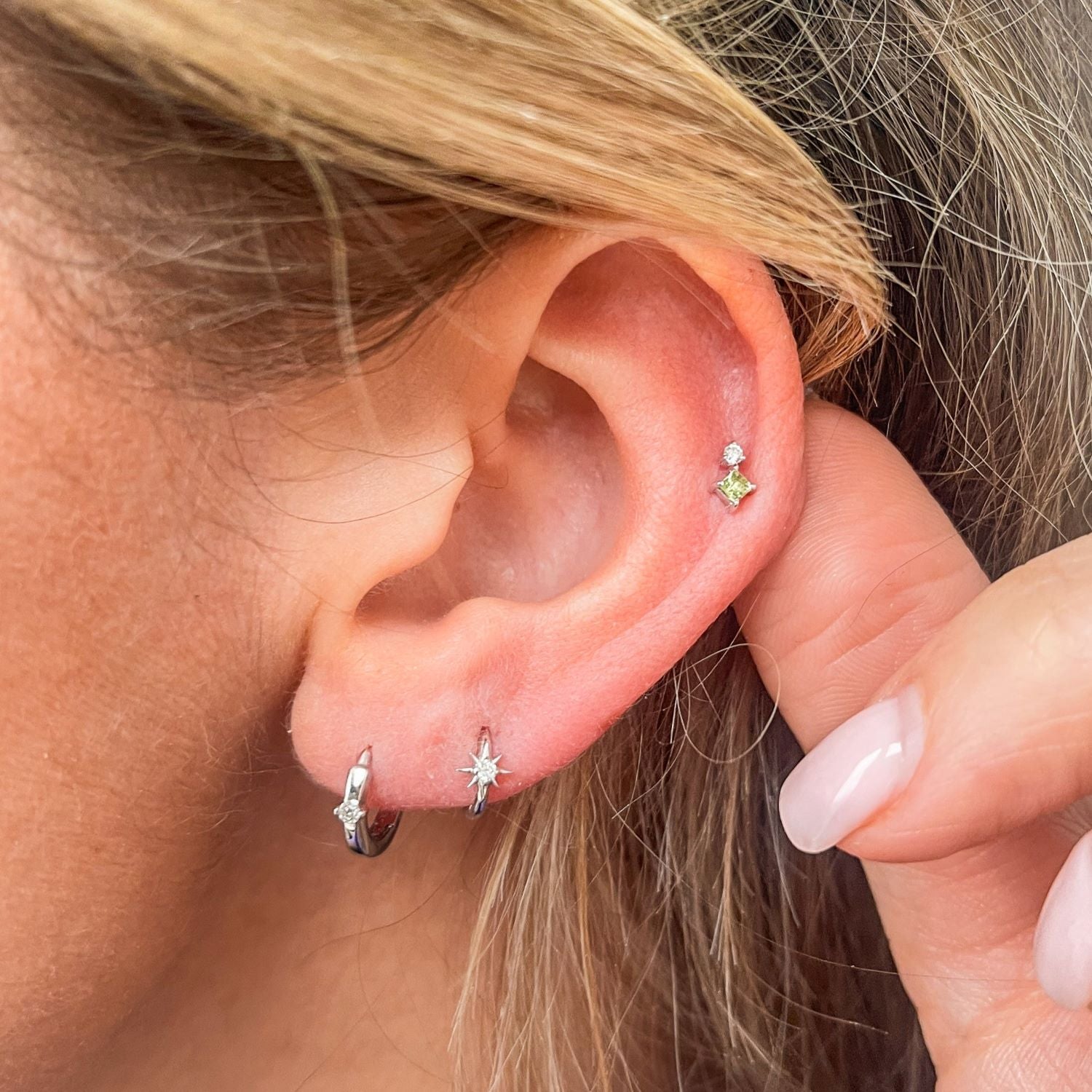This earring is sold as a single piece and is made from solid 9k white gold with a diamond. The gold is recycled.