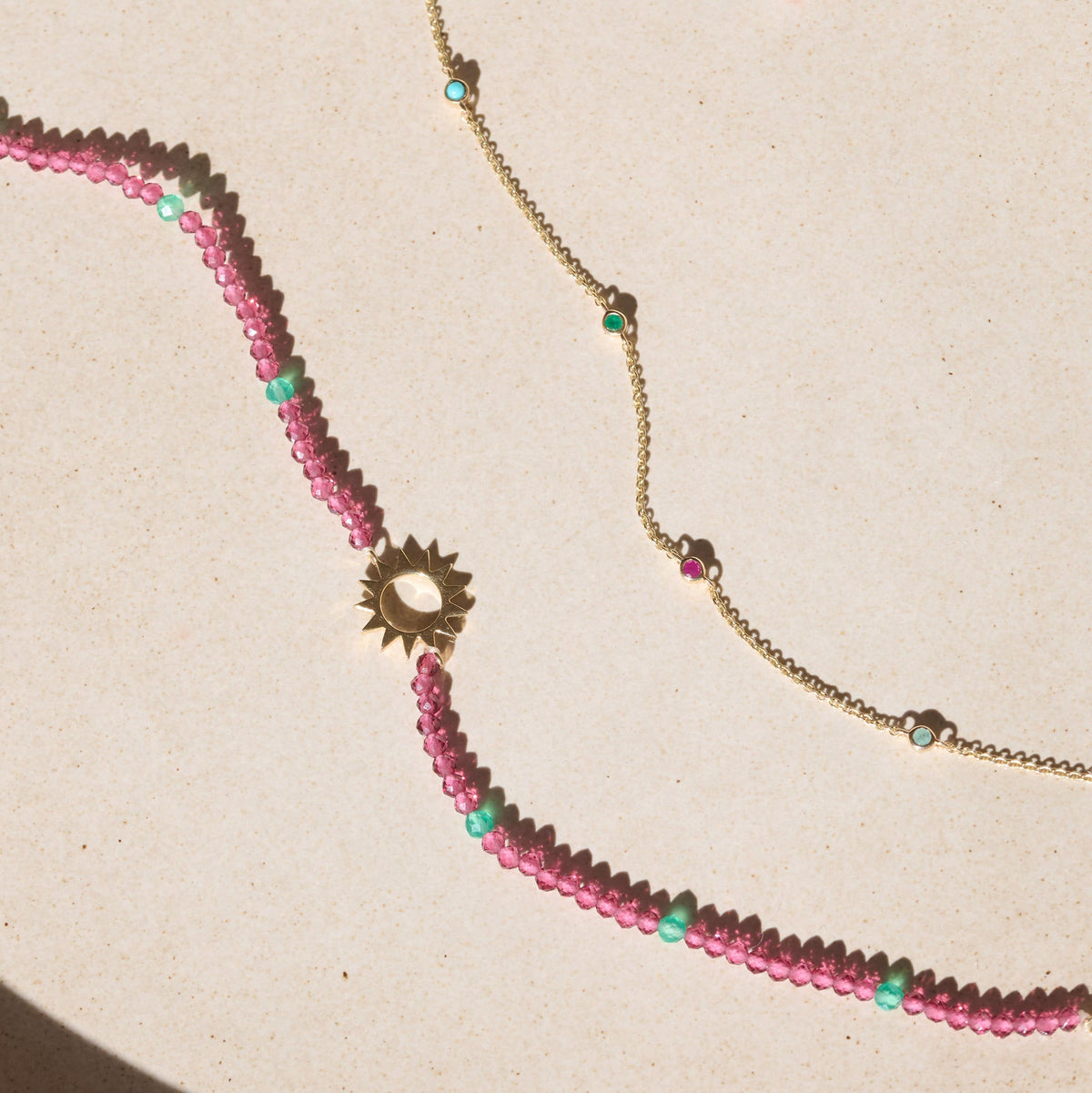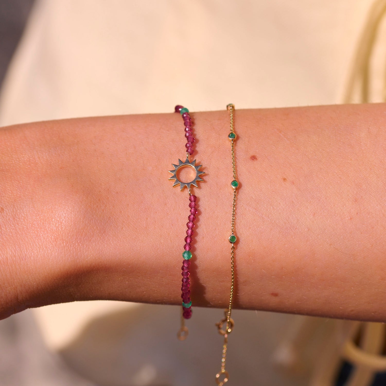 This bracelet is made from recycled solid 9K gold and features a sunburst silhouette design with vibrant pink quartz and onyx beads.